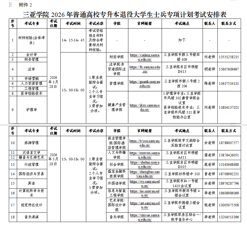 2.三亚学院2026年普通高校专升本退役大学生士兵专项计划考试安排表