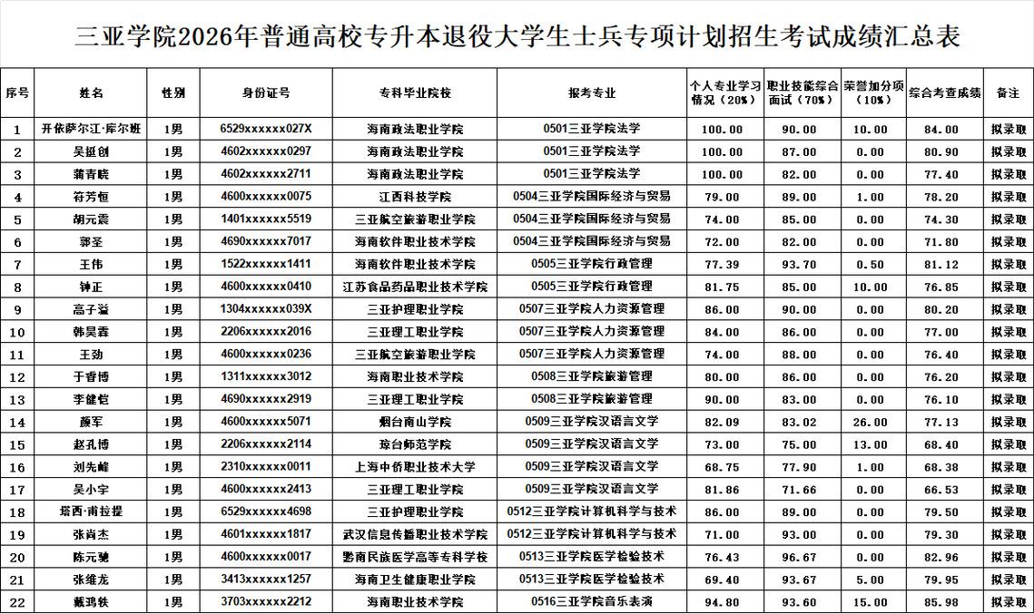 根据《海南省教育厅关于做好2026年我省普通高等学校专升本考试招生工作的通知》要求,结合我校《三亚学院2026年普通高校专升本退役大学生士兵专项计划招生考试工作实施办法》相关规定,经严格考查,现将2026年三亚学院专升本“退役大学生士兵”专项计划考生成绩合格名单予以公示。
